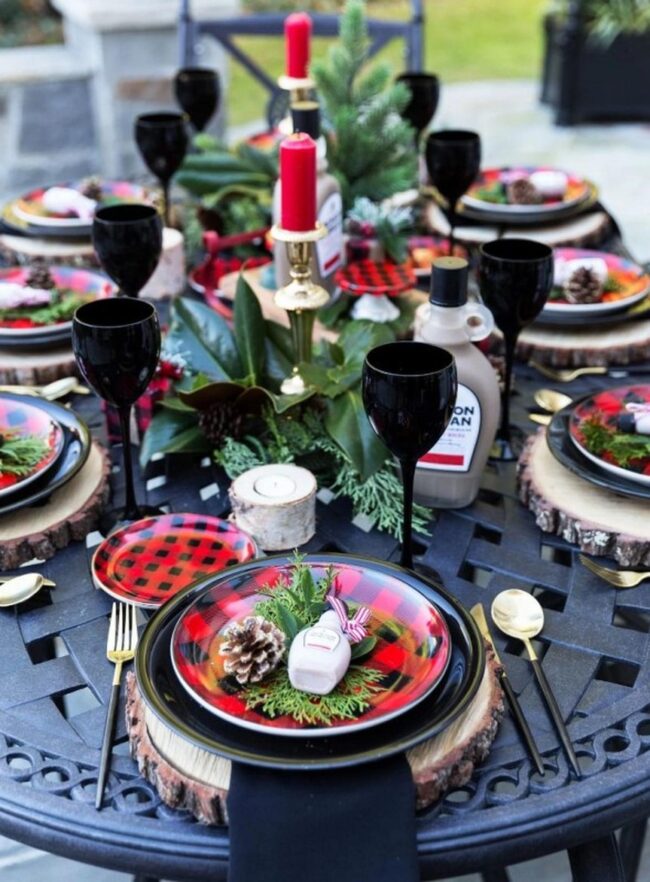 Plaid plates perched on wooden chargers instantly grab attention, while sleek black wine glasses dance alongside golden cutlery for an effortless blend of casual and chic.