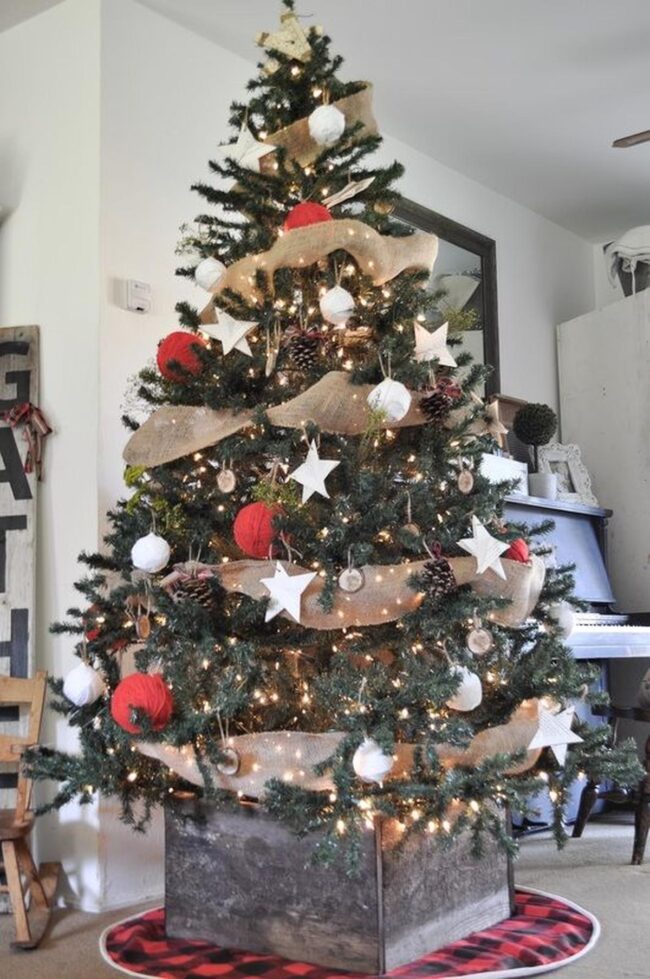 Charming pinecones and handmade ornaments like delicate yarn balls and white stars dance between branches, creating a countryside symphony of texture and color.