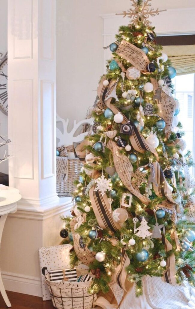 Sparkling blue and white ornaments create melodic harmony across each carefully decorated limb.