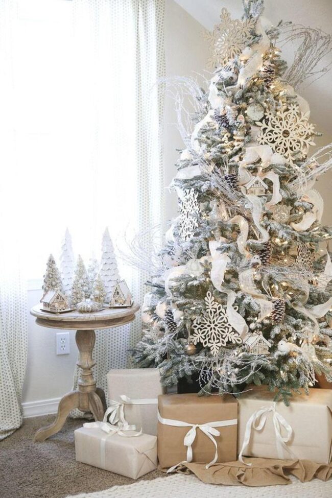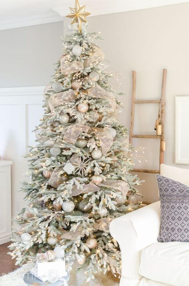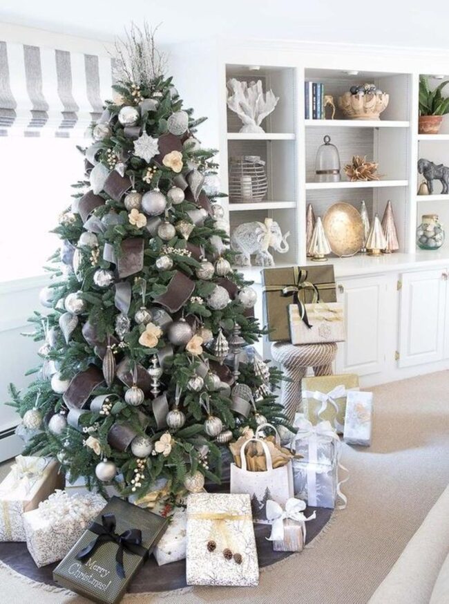 Magical Christmas scenes burst with enchantment, where silver and white ornaments dance across a beautifully adorned tree wrapped in elegant brown ribbons.