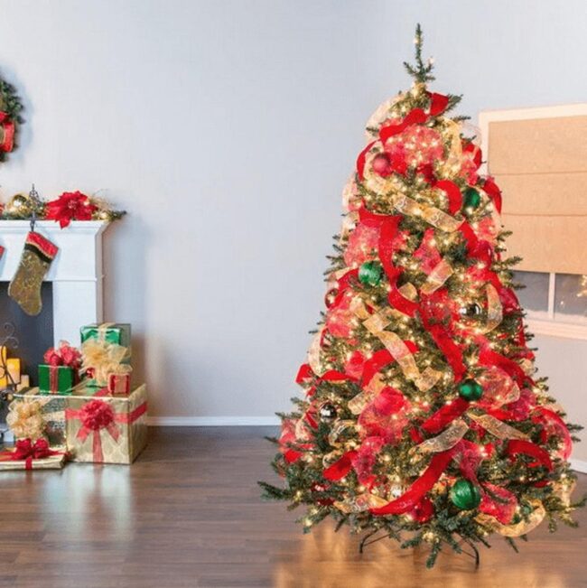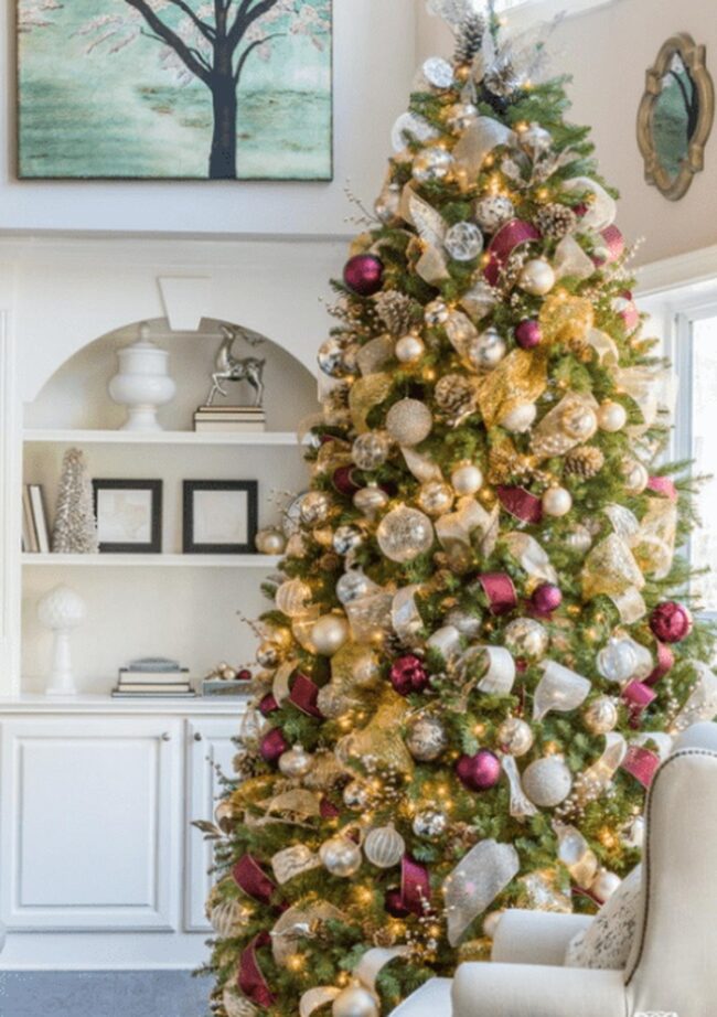 Ribbons, garlands, and lights layer depth and sparkle, turning the tree into the centerpiece of celebration.