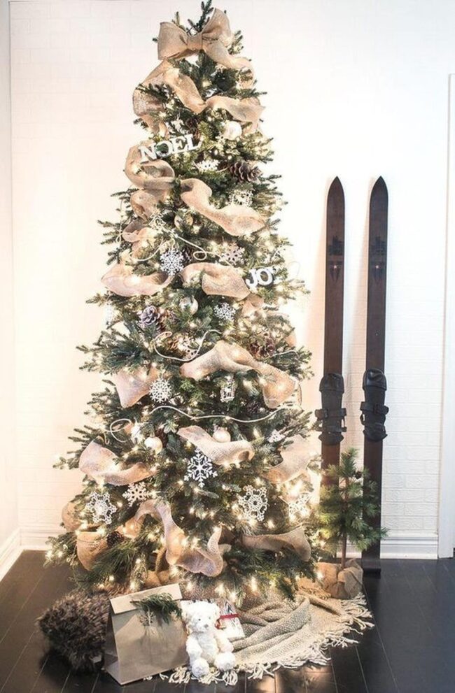 Burlap ribbons cascade gracefully through evergreen branches, creating a woodland wonderland that feels both inviting and magical.