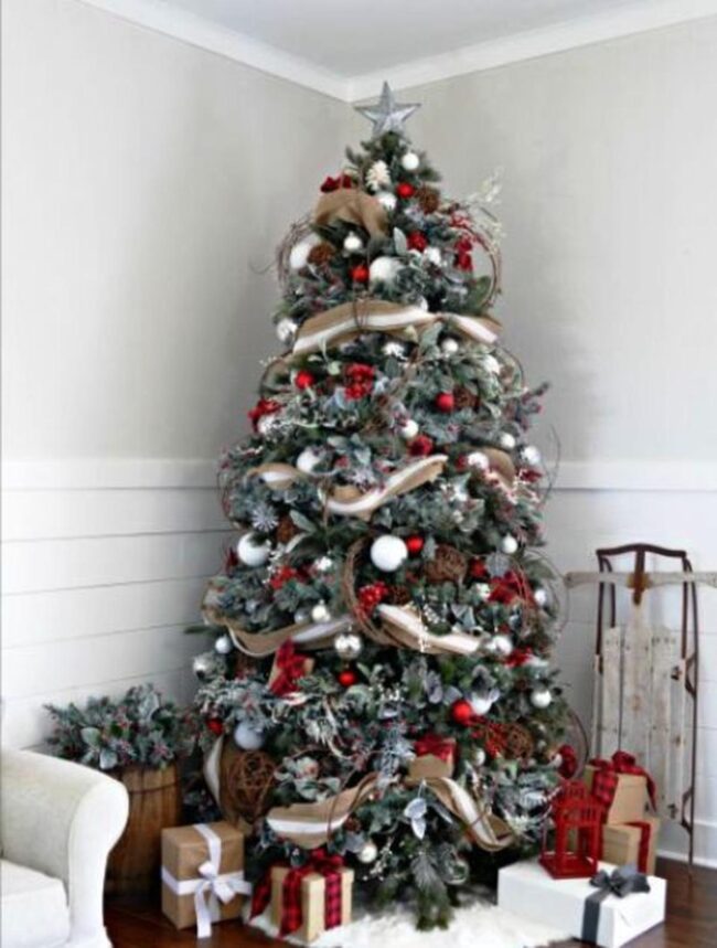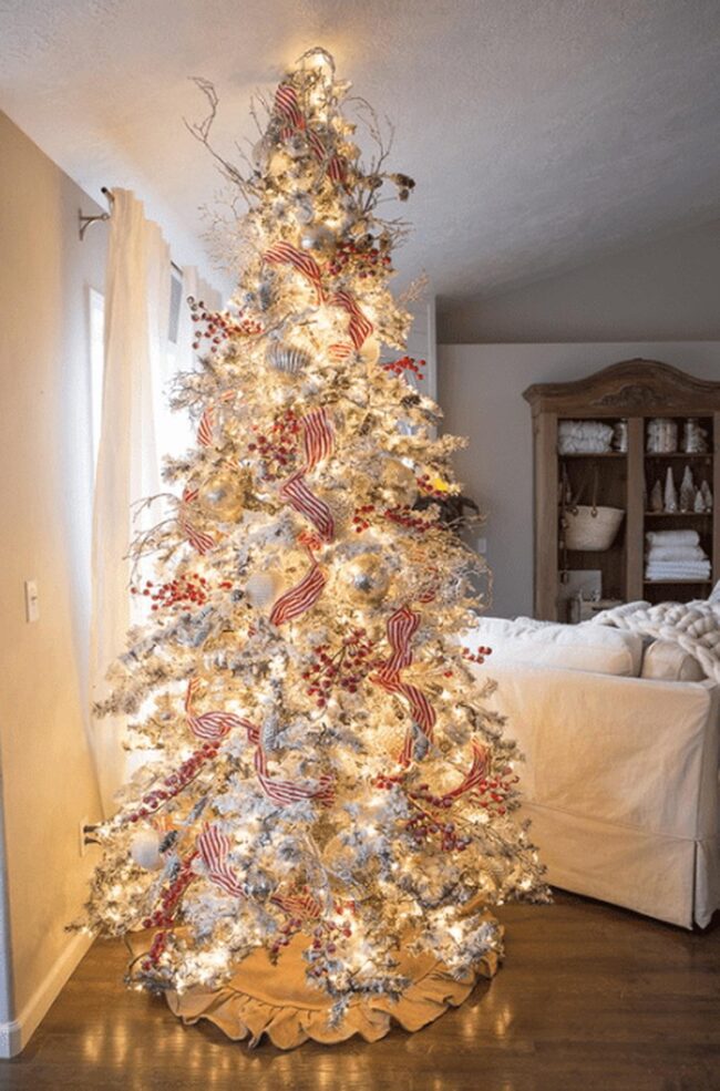 Magical Christmas vibes dance through your space when you blend white and green trees with sparkling red and silver ornaments that catch every light.