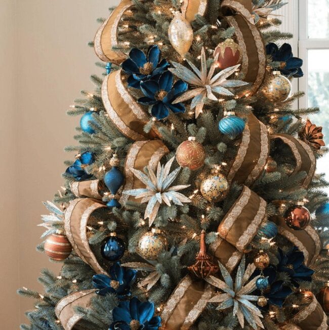 Christmas magic springs to life with stunning gold and deep blue ornaments that dance across evergreen branches, drawing every eye instantly.
