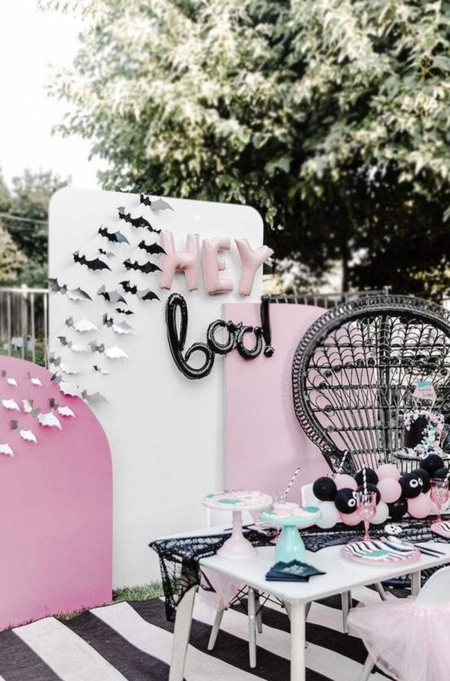 Halloween decorations burst with unexpected charm, blending soft pink and stark black into a delightful party scene that catches everyone's eye.