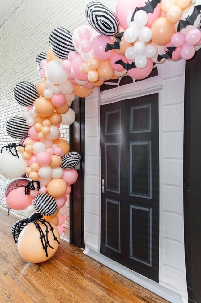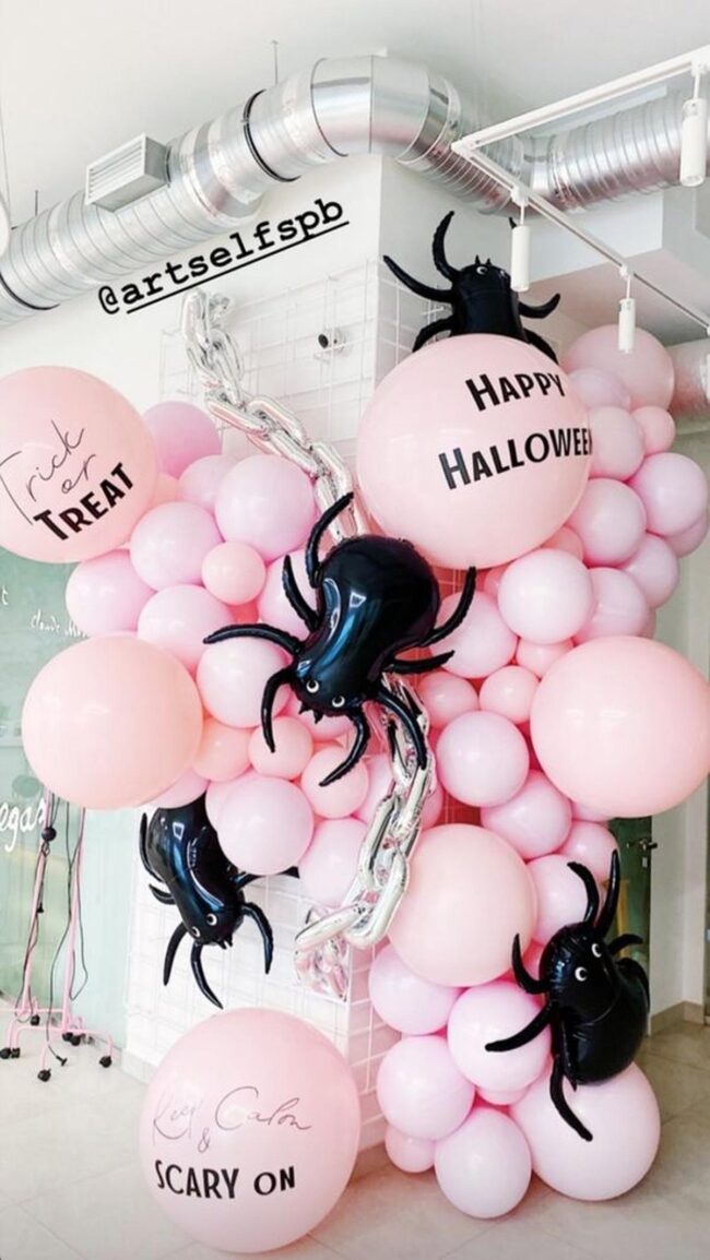Halloween decorations burst with unexpected charm when pink balloons dance alongside black spheres, creating a whimsical backdrop for quirky spider decorations.