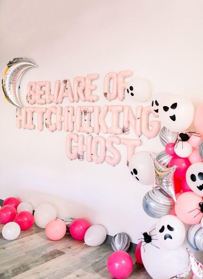 Soft pink balloon letters dance across walls, spelling out festive Halloween cheer with unexpected charm.