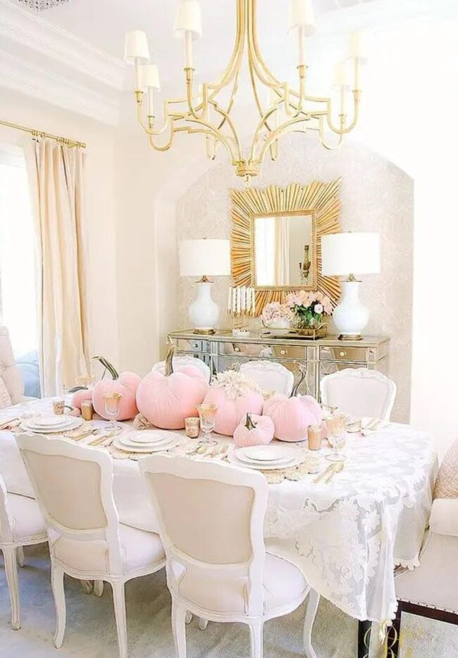 Delicate lace tablecloths underneath quirky pink pumpkins add unexpected charm that makes guests smile spontaneously.
