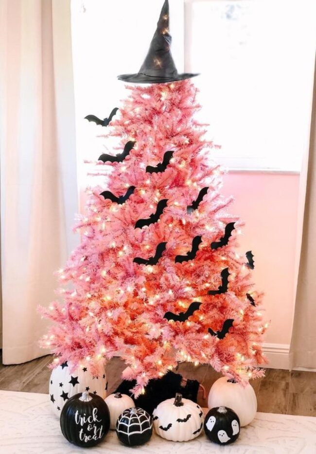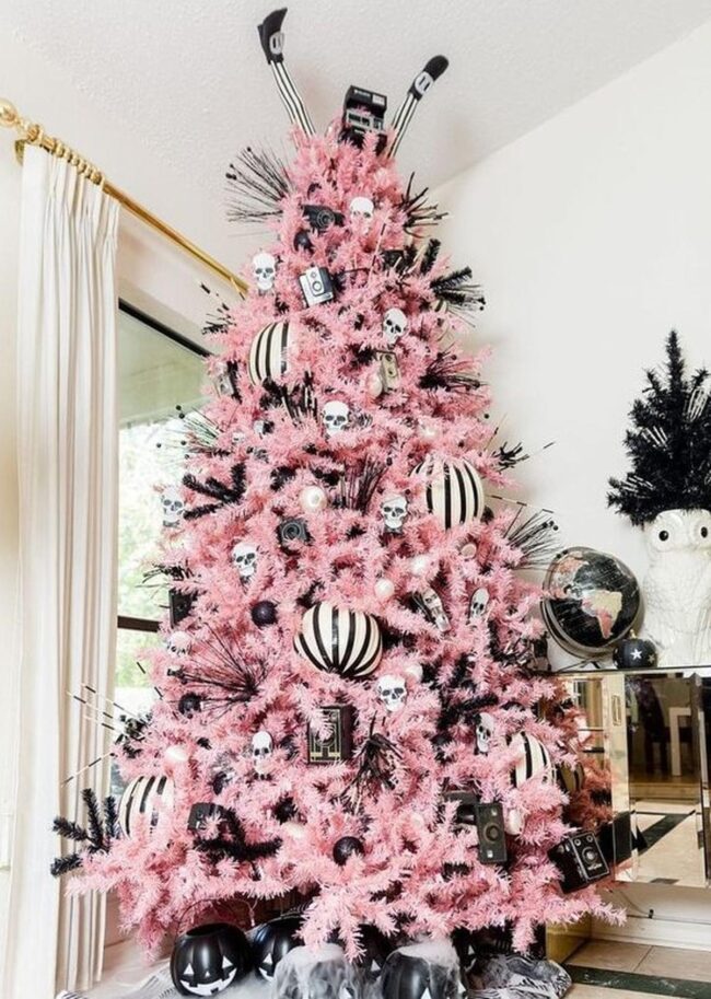 Magical pink Christmas trees can totally rock Halloween decor when paired with whimsical black paper bats swooping around the branches! Soft white lights weave through evergreen needles, casting enchanting shadows that dance across nearby walls.
