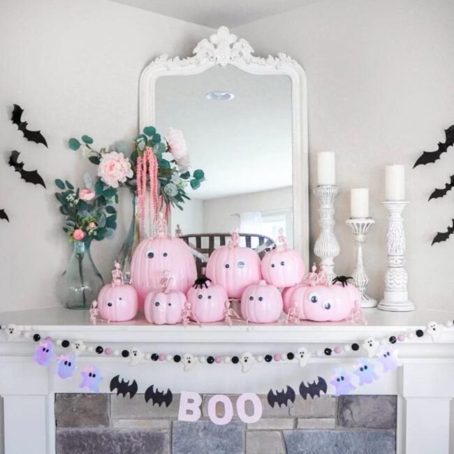 Pink pumpkins with cheeky eyes spark joy and playfulness across this festive mantel, inviting viewers to embrace Halloween's whimsical side.