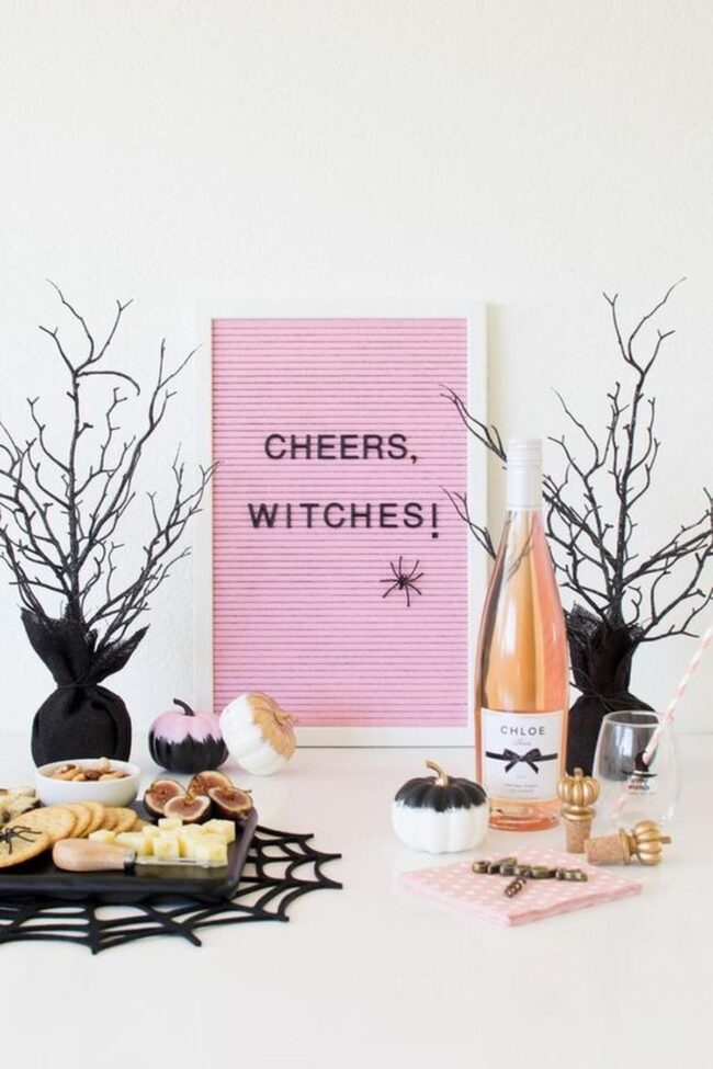 Your witty pink letter board displaying "CHEERS, WITCHES!" adds a playful punch to the overall aesthetic.