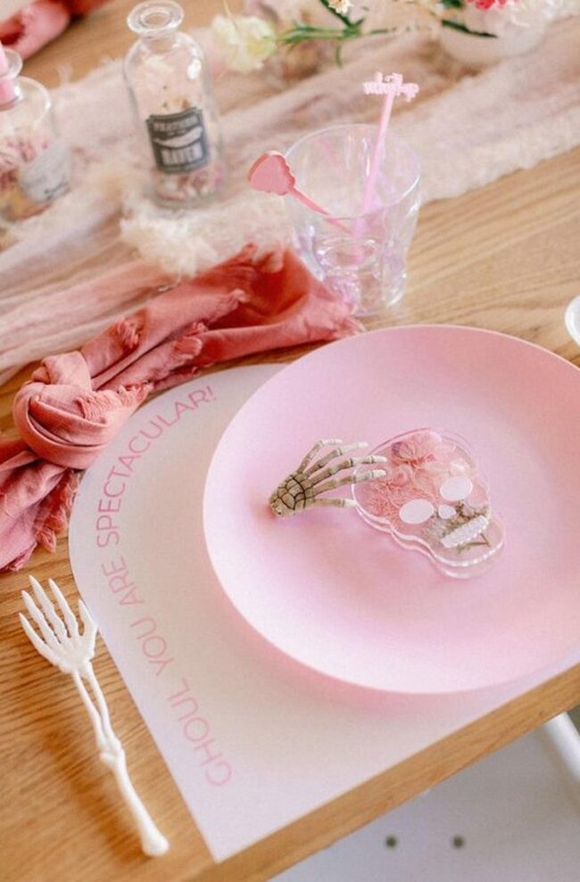 Halloween gets a sweet makeover with skull-adorned pink table settings that blend creepy and cute perfectly.