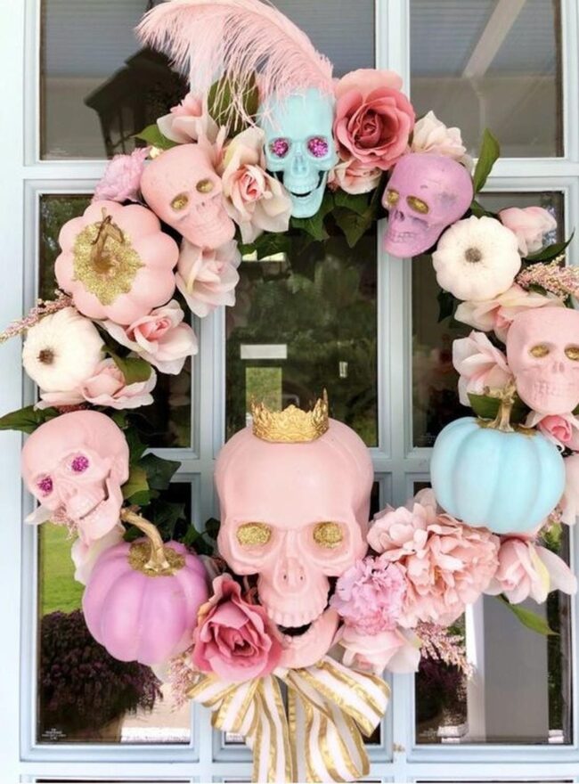 Halloween decor gets a stunning makeover with pastel skulls that sparkle and surprise! Delicate pink silk flowers wrap around golden-crowned centerpieces, softening traditional spooky vibes into chic statement pieces.