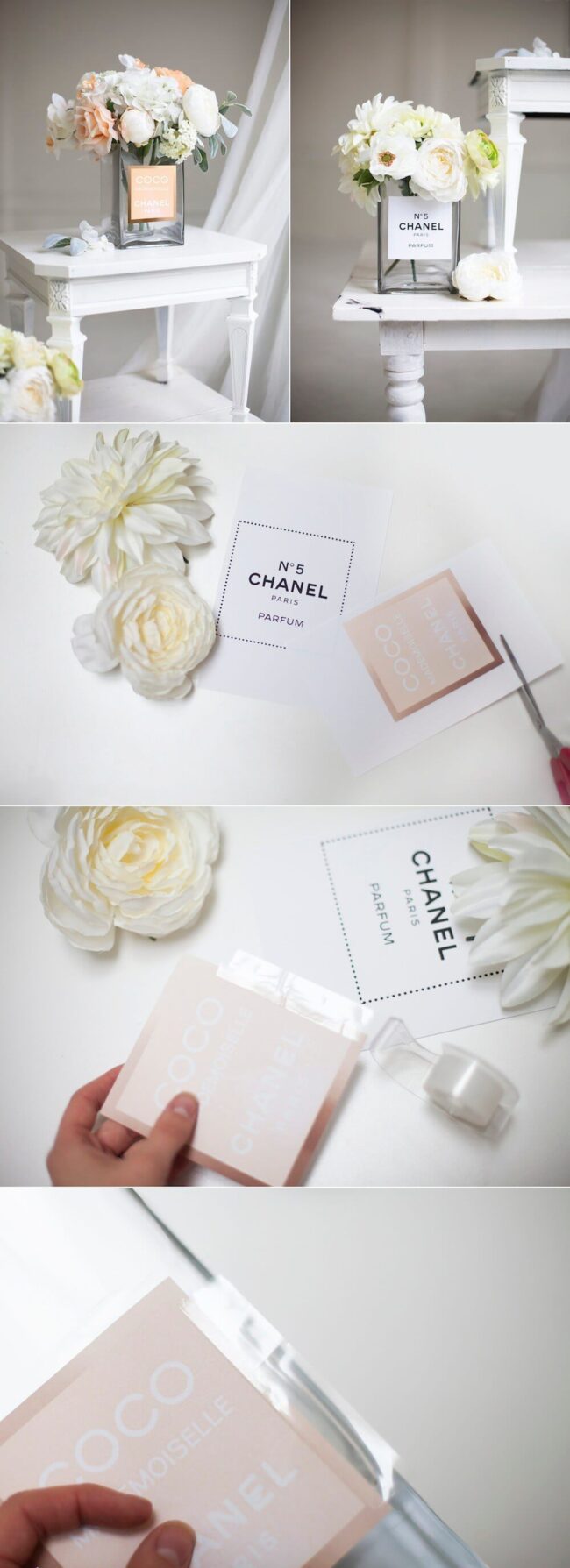 Unexpected design choices like oversized perfume bottle vases demonstrate personal style and creativity.