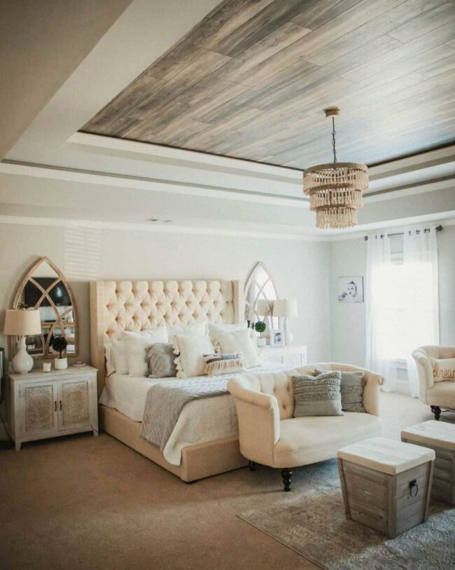 Rustic plank tray ceilings draw eyes upward with their natural, textured beauty.