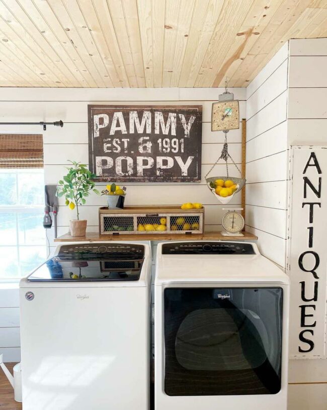 Rustic country laundry rooms radiate charm through light wooden shiplap ceilings that anchor the space with natural elegance.