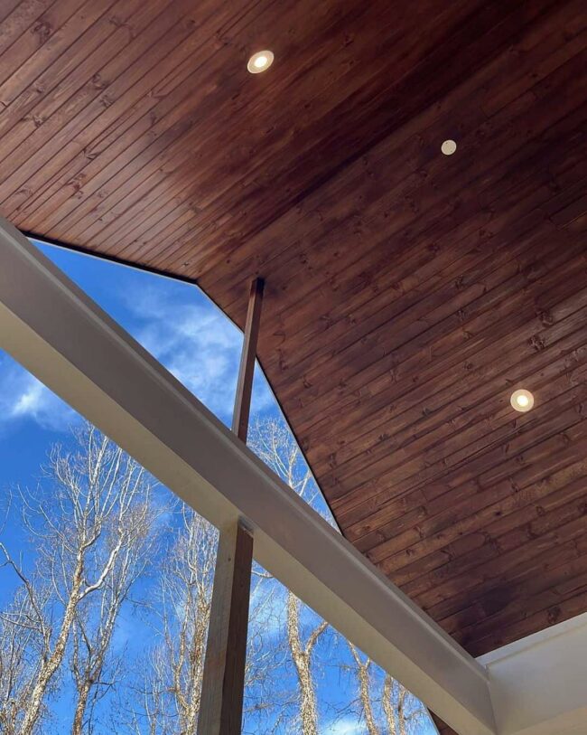 Recessed lighting elegantly highlights the intricate tongue and groove ceiling design.
