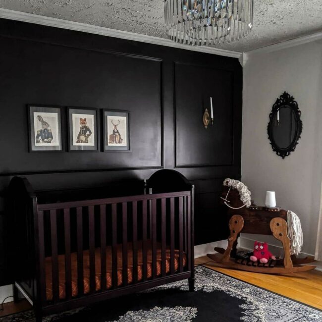 Monochrome nursery rooms captivate with their bold black accent wall, instantly commanding attention and setting a sophisticated tone.