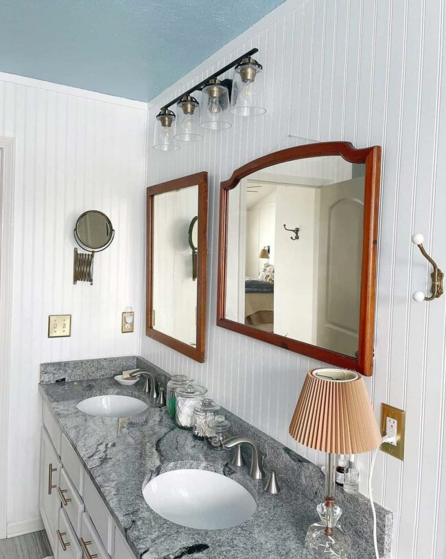 Blue ceilings transport bathrooms into enchanting retreats with nostalgic charm.