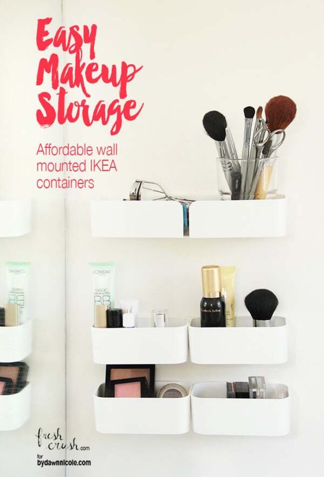 Plastic containers from Ikea offer an ingenious organizational system that keeps makeup accessible and tidy.