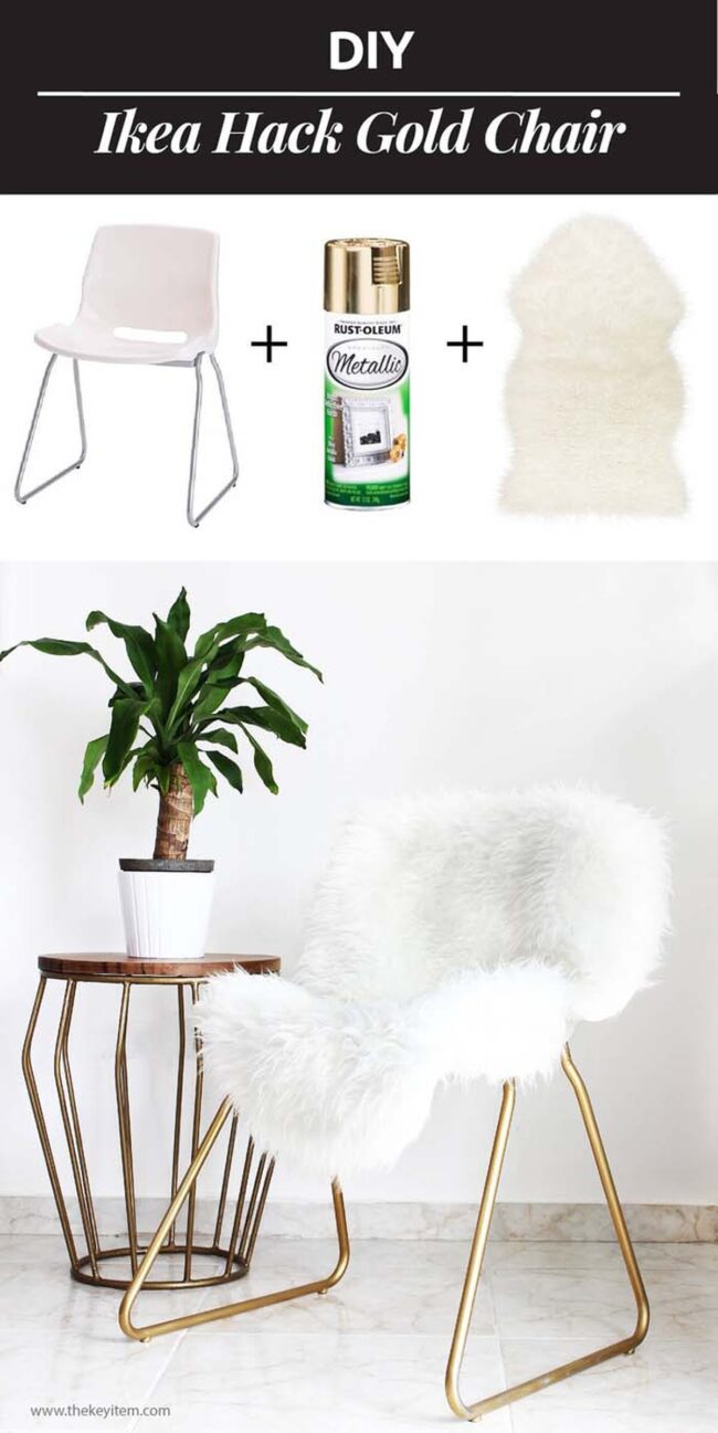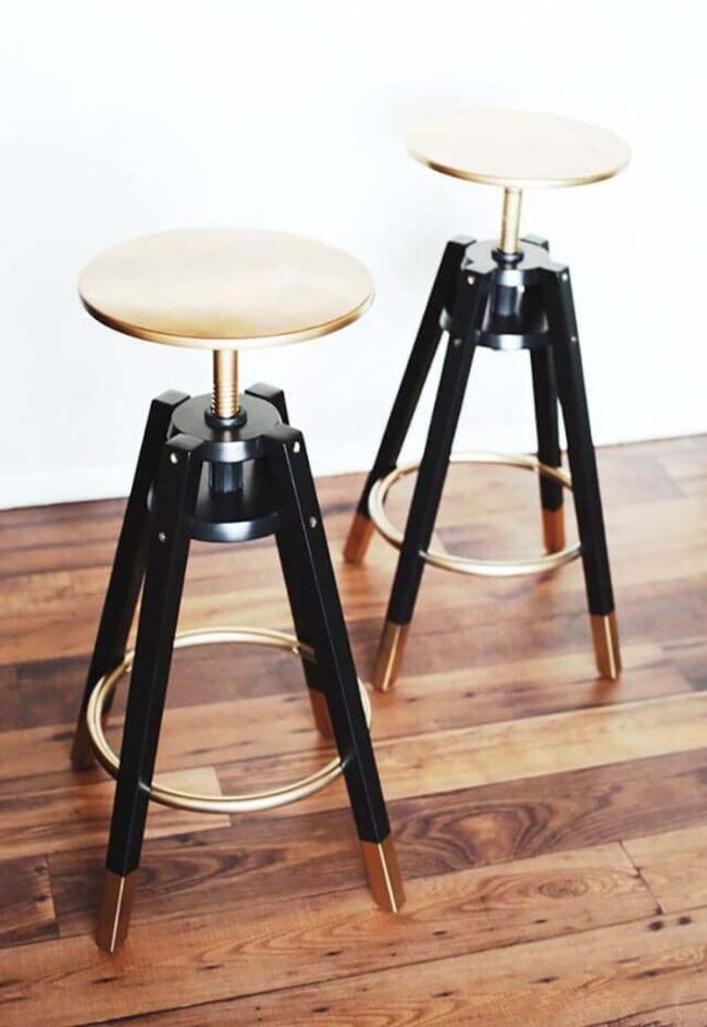 Gold metallic spray paint dramatically upgrades standard chair legs, creating an instant glamorous touch.