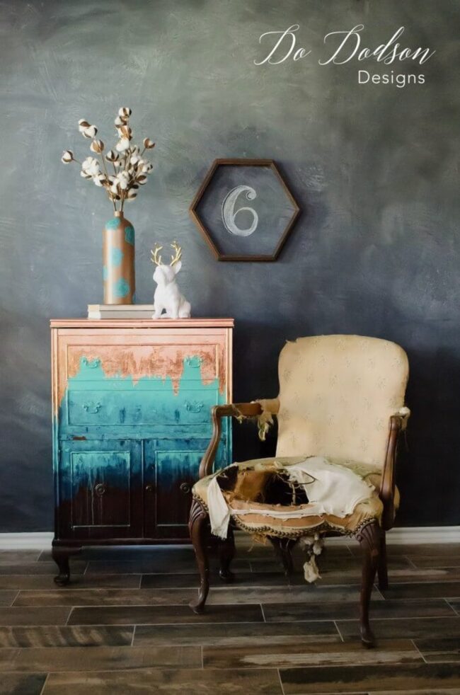 Copper-toned drippy paint brings dramatic flair to furniture makeovers, creating an unexpected artistic statement that catches everyone's eye.
