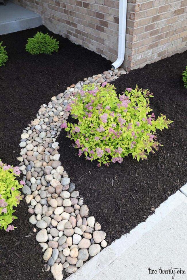 Pebble downspout paths create a stunning landscape solution that redirects water while boosting curb appeal with minimal effort.