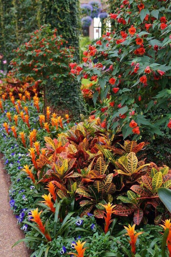 Colorful croton plants bring dramatic tropical flair to outdoor landscapes with their spectacular multicolored leaves ranging from deep burgundy to vivid green and golden yellow.