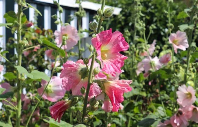 Hollyhocks create dramatic vertical interest with their towering stems and abundant blossoms that self-seed and return year after year.