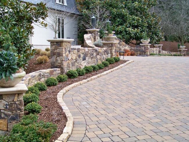 Brick, natural stone, and synthetic turf offer homeowners versatile design options for creating stunning border accents along driveway perimeters.