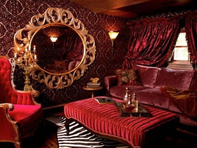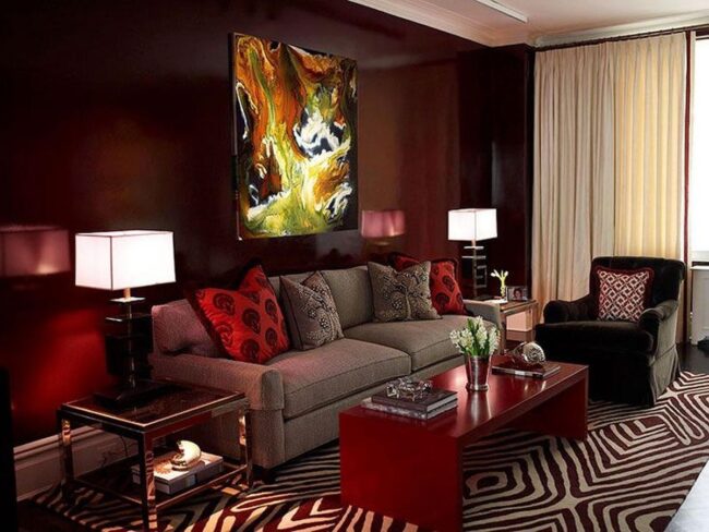 Burgundy and red colors dance through this inviting living room, promising comfort and style that whispers pure magic.