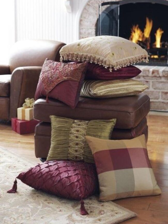 Plush pillows in deep burgundy and gold tones scatter playfully across furniture, adding rich personality and visual interest to every corner.