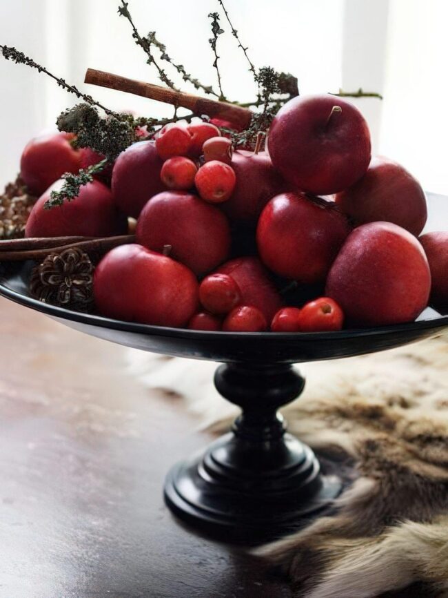 Decorative scenes burst with personality when natural elements blend seamlessly, like deep red apples nestled in a dark wooden bowl accompanied by delicate cinnamon sticks and weathered twigs.