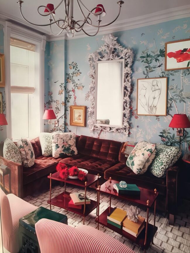 Intricate patterned wallpaper wraps walls with personality, adding depth without overwhelming your senses.