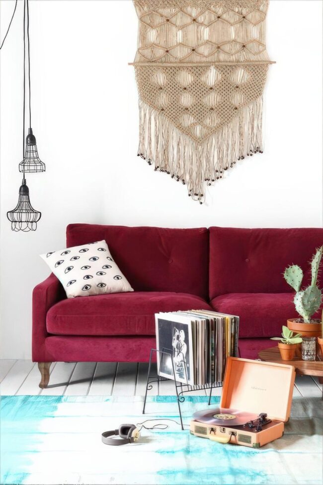 A woven wall hanging draped above the sofa whispers stories of natural craftsmanship, refreshing a plain wall into an artistic canvas.