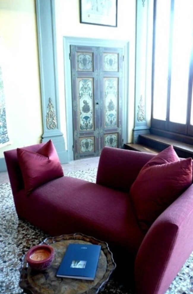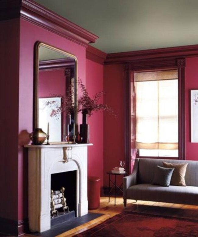 Wall colors in deep reddish-pink radiate an inviting atmosphere that instantly draws your eye across the room.