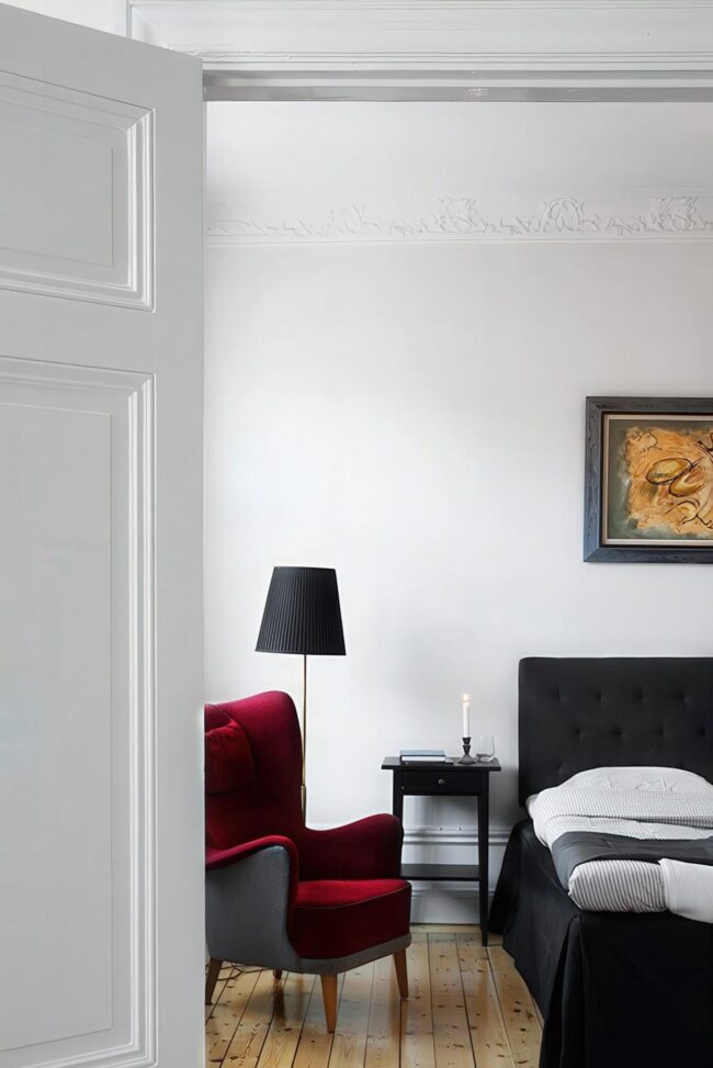 Dramatic red armchairs pop against neutral backgrounds, adding unexpected personality without overwhelming visual harmony.