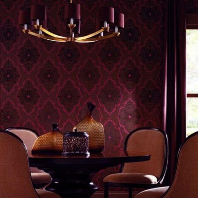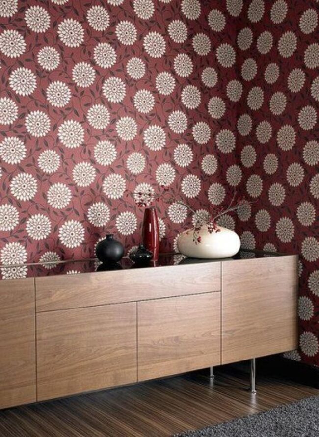 Vibrant red floral wallpaper instantly grabs your attention, modernizing an ordinary room into a stunning sanctuary with dramatic visual appeal.