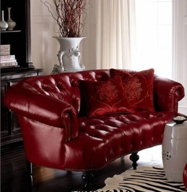 Red leather dominates the living room with its luxurious tufted sofa, drawing immediate attention while embroidered pillows add rich texture and character.