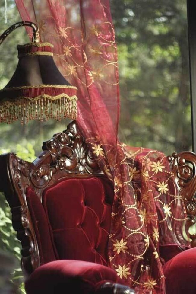 Scarlet curtains drape elegantly around windows, infusing depth and character into the peaceful space.