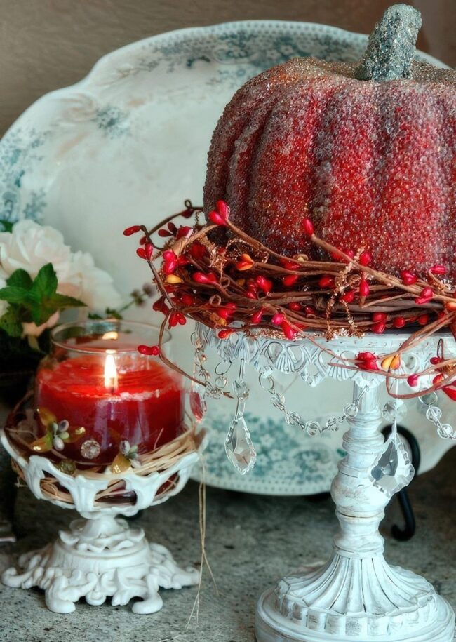 Fall's magic bursts to life with a crystal-adorned pumpkin perched elegantly on a white stand, radiating sophistication through its sparkling details.