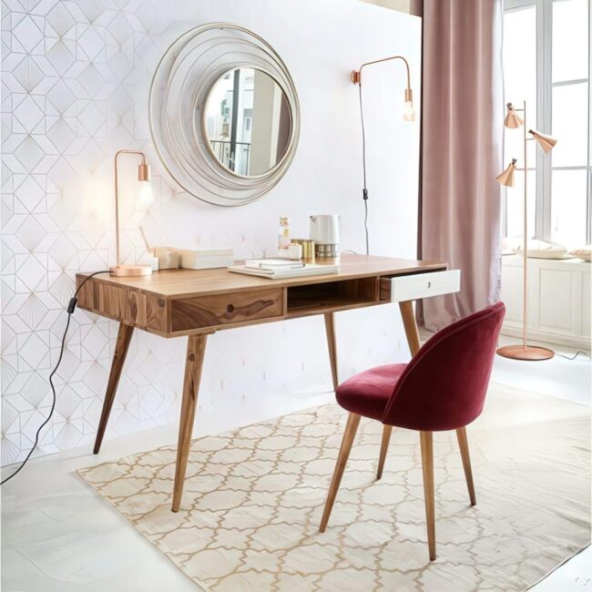 Wooden desks with mixed storage options blend practicality and style seamlessly, inviting you to work with inspiration.