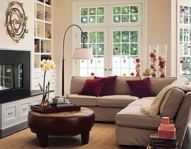 Soft beige sofas adorned with deep crimson pillows command attention, creating an instantly appealing focal point that draws eyes across the room.