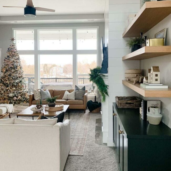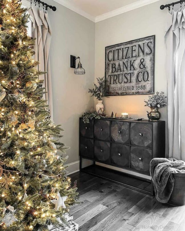 Grey walls embrace the living room, setting a calm stage for a festive Christmas tree that radiates holiday warmth.