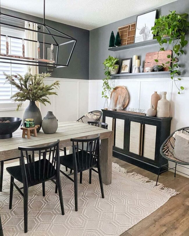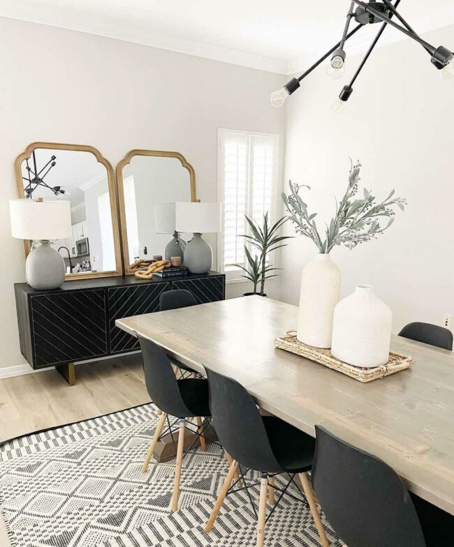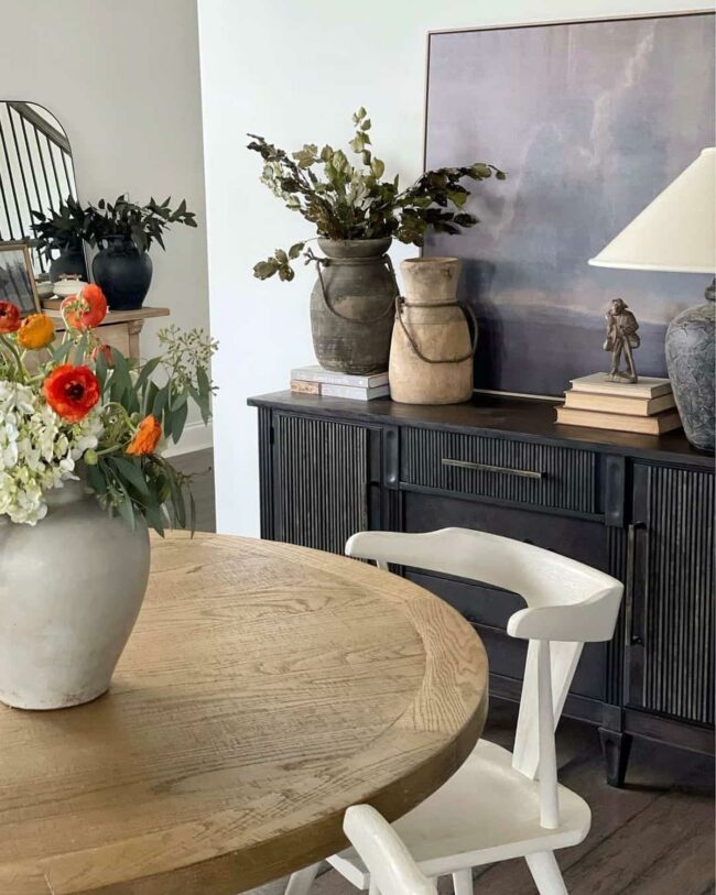 Light grey walls provide a calming canvas for this charming dining space, where a striking black buffet stands out dramatically against soft surroundings.