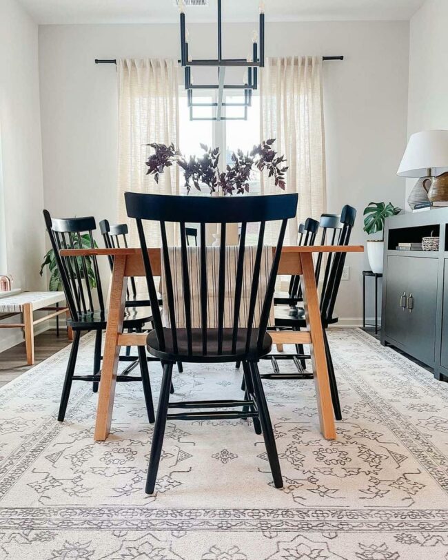 Black chairs surround a wooden dining table, making a bold statement against a crisp white rug.