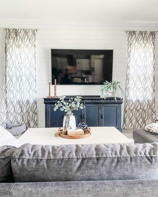 Crisp white shiplap walls make a bold statement, drawing attention to the stylish black sideboard that anchors the space.