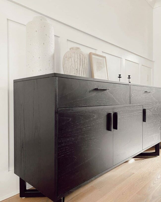 Black buffet styling contrasts beautifully with pristine white walls, making a bold statement about modern design.
