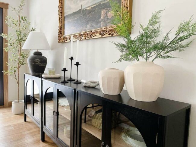 White ceramic jars sit atop a bold black buffet, drawing eyes across the room.