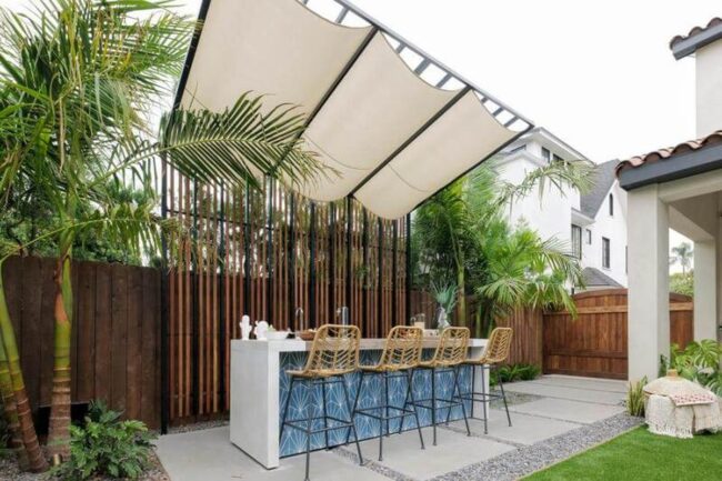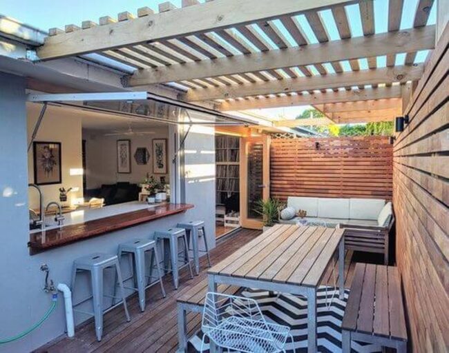 Outdoor bar covers protect your entertainment space from unexpected rain while letting sunlight stream through slatted wooden panels.